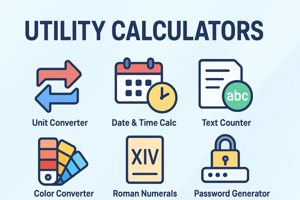 Explore our free online utility calculators including Unit Converter, Date & Time Calculator, Text Counter, Color Converter, Roman Numerals, Password Generator, and more. Accurate, fast, and easy to use.